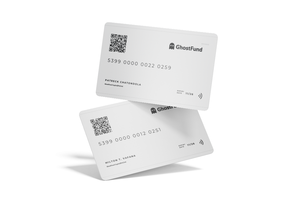 GhostFund Cards are more than just payment tools; they are symbols of trust and empowerment. Each card carries the GhostFund brand, giving agents and contributors a professional way to transact, invest, and build credibility.